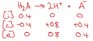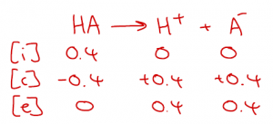 This assumption is useful because we can work out the end [H+] and pH simply from the concentration of acid that we start with and we don’t have to worry about any equilibrium constants. An ICE table can be useful to see what’s going on (but probably unnecessary):
