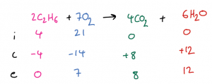 A very common type of question in Chemistry is where we need to calculate the amount of each product formed from an initial amount of reactants. One of the most efficient ways to do this this calculation is to use an ICE table (Initial – Change – End).