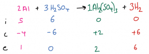 | Example 2: 5 mol of Al are mixed with 6 mol of H2SO4 and react. Calculate the amount of Al2(SO4)3 and H2 produced. First, we write out the balanced symbol equation at the top of the ICE table, and fill in the initial moles for both reactants and also both products. Then, determine which is the limiting reactant. i.e., Al: 5 / 2 = 2.5 and H2SO4: 6 / 3 = 2. The result for H2SO4 is smaller so it is the limiting reactant. The end amount of H2SO4 is therefore 0 and the change is -6. Then, use the 2:3:1:3 ratio in the balanced symbol equation to complete the change row for the other substances Finally, use the initial and change amounts to calculate the end amounts for the other substances.