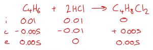 | Worked Example: Buta-1,3-diene reacts with HCl through electrophilic addition. HCl can be added either once or twice to each diene molecule forming a series of position isomers with the formulas C4H7Cl and C4H8Cl2. 0.540 g of C4H6 react with 50 cm3 of 0.2 mol dm-3 HCl. The mass of 2,3-dichlorobutane formed was 0.254 g. What is the % yield? We first need to calculate the amounts of each reactant: n C4H6 = 0.540 / 54 = 0.01 mol n HCl = 0.2 x 50 / 1000 = 0.01 mol Equation: C4H6 + 2 HCl –> C4H8Cl2 Using an ICE table, we can see that 0.01 mol of HCl reacts with 0.005 mol of C4H6 forming 0.005 mol of C4H8Cl2. This is the maximum theoretical moles of C4H8Cl2. The limiting reagent in this case is HCl because it is completely used up. The actual moles of C4H8Cl2 (Mr = 127) formed is 0.254 / 127 = 0.002 mol so the % yield is 0.002 / 0.005 x 100 = 40%. An obvious way to increase the % yield would be to ensure that HCl is in excess. This would ensure that any C4H7Cl (i.e., which has one remaining C=C) reacts further to form the dihalogenoalkane. |